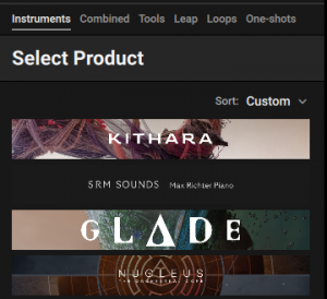 Within the ‘Play’ view, installed libraries are shown as tiles. Selecting a tile filters the ‘Results’ list with relevant presets. Hovering over a tile reveals an arrow icon (>) which when clicked loads the first preset of the associated product.