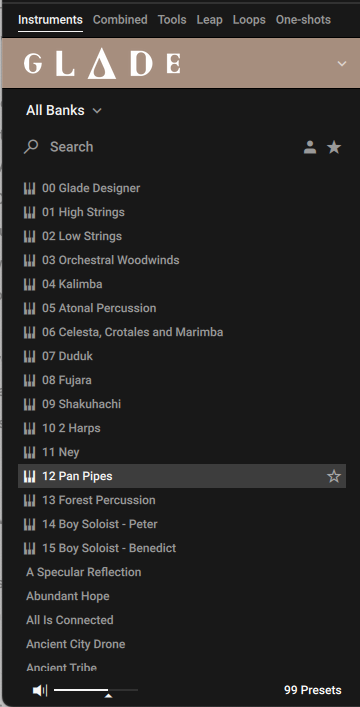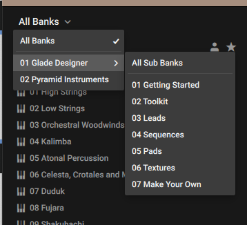 Designer Interface presets are sorted into ‘banks’. These are collections of presets which have a common characteristic or use within your compositions. These are standardized between products that utilise this interface.