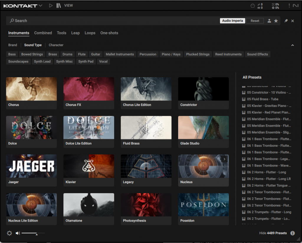 The ‘Library’ browser provides access to viewing many instruments and snapshots at once, with additional controls to filter by brand, tags, text and Favourites. The Kontakt manual contains in depth information on loading instruments and snapshots from this browser, so we will cover Audio Imperia specific information.